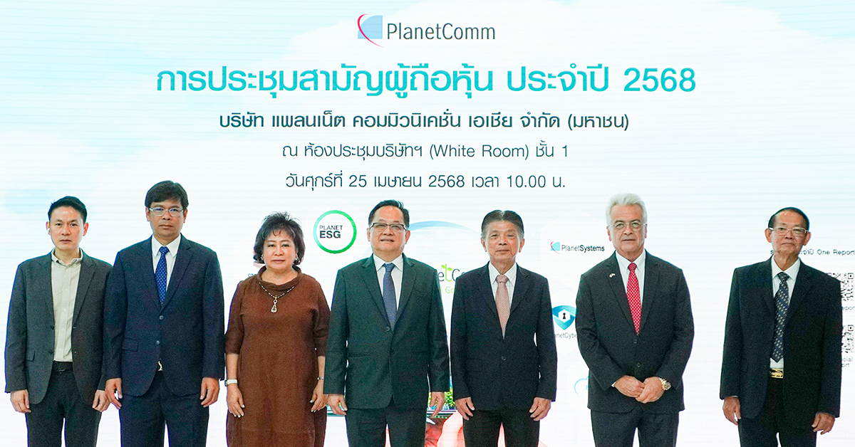 ดร.รัตติกร วรากูลศิริพันธุ์ (ที่ 3 จากขวา) ประธานกรรมการ คุณประพัฒน์ รัฐเลิศกานต์ (ที่ 4 จากซ้าย) ประธานเจ้าหน้าที่บริหาร พร้อมด้วยคณะกรรมการ บริษัท แพลนเน็ต คอมมิวนิเคชั่น เอเชีย จำกัด (มหาชน) หรือ PLANET ถ่ายภาพร่วมกันในงานการประชุมสามัญผู้ถือหุ้นประจำปี 2568 เมื่อวันที่ 25 เมษายน 2568 โดยที่ประชุมมีมติอนุมัติเพิ่มทุนจดทะเบียนจำนวน 420,187,264 บาท จากทุนจดทะเบียนเดิม 823,504,530 บาท เป็นทุนจดทะเบียนใหม่ 1,243,691,794 บาท โดยออกหุ้นเพิ่มทุนจำนวนไม่เกิน 420,187,264 หุ้น มูลค่าที่ตราไว้หุ้นละ 1 บาท แบ่งจัดสรรให้แก่ผู้ถือหุ้นเดิม (Right Offering) จำนวนไม่เกิน 210,093,632 หุ้น สัดส่วน 3 หุ้นเดิมต่อ 1 หุ้นใหม่ ราคาหุ้นละ 2 บาท และรองรับการใช้สิทธิใบสำคัญแสดงสิทธิที่จะซื้อหุ้นสามัญสามัญบริษัท ครั้งที่ 3 (PLANET-W3) ที่จะออกและจัดสรรให้แก่ผู้ถือหุ้นเดิมที่จองซื้อและได้รับจัดสรรหันสามัญเพิ่มทุนที่ออกและเสนอขายให้แก่ผู้หุ้นเดิมตามสัดส่วนการถือหุ้น (Right Ofering) จำนวนไม่เกิน 210,093,632 หุ้น วัตถุประสงค์เพื่อสร้างความแข็งแกร่งทางด้านการเงิน รองรับการลงทุนและขยายธุรกิจของบริษัทในอนาคต