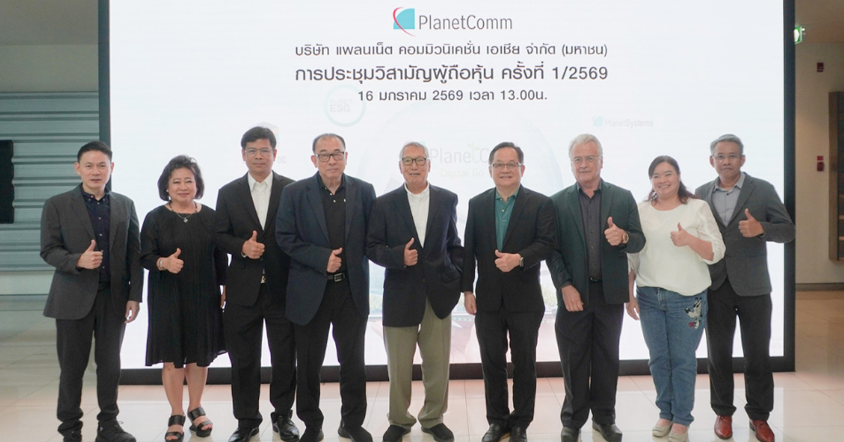 ร้อยโทสมศักดิ์ ยมะสมิต (กลาง) ประธานกรรมการ พร้อมด้วยคณะกรรมการ บริษัท แพลนเน็ต คอมมิวนิเคชั่น เอเชีย จำกัด (มหาชน) หรือ PLANET ถ่ายภาพร่วมกันในงานประชุมวิสามัญผู้ถือหุ้น ครั้งที่ 1/2569 ในวันที่ 16 มกราคม 2569 โดยที่ประชุมมีมติอนุมัติลดทุนจดทะเบียนของบริษัท จากทุนจดทะเบียนเดิม 1,243,691,794 บาท เป็นทุนจดทะเบียน 702,640,638 บาท และมีมติอนุมัติการเพิ่มทุนจดทะเบียนอีกจำนวนไม่เกิน 65,928,000 บาท ส่งผลให้ทุนจดทะเบียนใหม่ของบริษัทอยู่ที่ 768,568,638 บาท โดยการออกหุ้นสามัญเพิ่มทุนใหม่จำนวนไม่เกิน 65,928,000 หุ้น มูลค่าที่ตราไว้หุ้นละ 1 บาท เพื่อเสนอขายให้แก่บุคคลในวงจำกัด (Private Placement) ตามแบบมอบอำนาจทั่วไป (General Mandate) สำหรับเสริมสภาพคล่องและเตรียมความพร้อมด้านเงินทุนหมุนเวียน รองรับการขยายการลงทุนในอนาคต